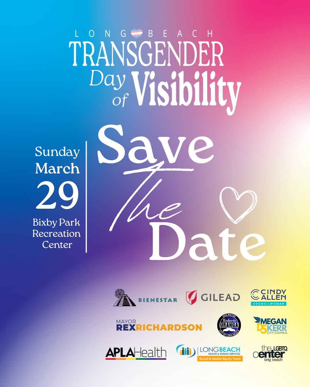 Join us for Transgender Day of Visibility (TDOV) on Sunday, March 29 at Bixby Park (130 Cherry Ave, Long Beach, CA 90802) as we come together to celebrate, uplift, and stand in solidarity with transgender and nonbinary community members.